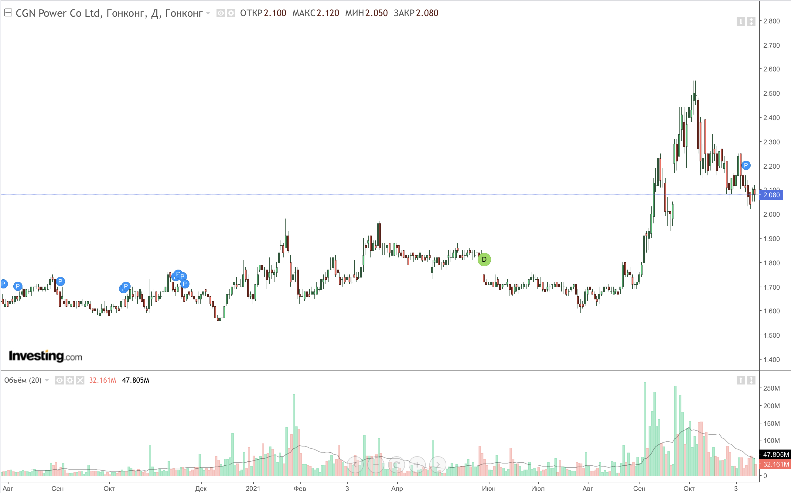 Коррекция акций CGN Power создает возможность для инвесторов на фоне анонсирования новых планов китайского правительства. По итогам COP26 руководство Поднебесной приняло решение о строительстве дополнительных 150 ядерных реакторов на территории страны, что является положительным сигналом для одного из крупнейших действующих операторов АЭС. При этом на краткосрочном горизонте перспективы компании по-прежнему благоприятные: зимние Олимпийские игры стартуют уже через 85 дней, что говорит о большой вероятности максимальной выработки "чистых" АЭС компании в ближайшие месяцы.