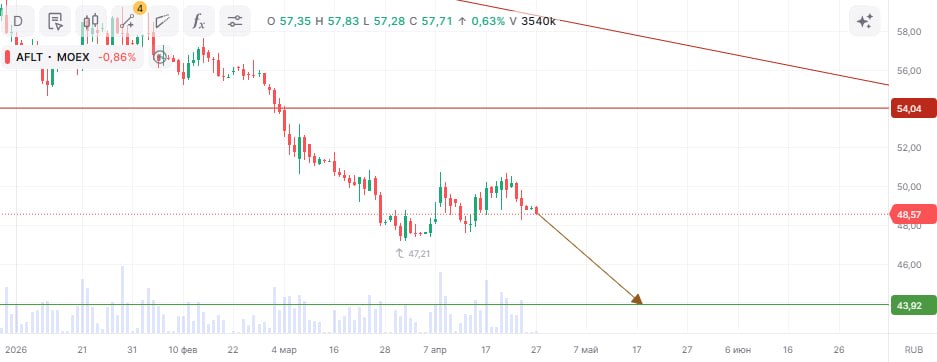 Актив находится в устойчивом нисходящем тренде. При выставлении стоп-заявки на уровне 54,04 руб., риск на портфель составит 0,77%. Соотношение прибыль/риск составляет 1,18.