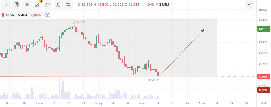 Актив находится в устойчивом восходящем тренде. При объеме позиции в 8% и выставлении стоп-заявки на уровне 11,329 руб., риск на портфель составит 0,44%. Соотношение прибыль/риск составляет 3,21.