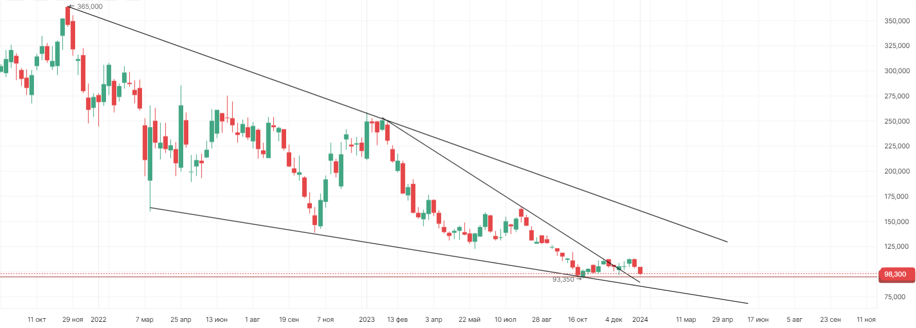 Акции JD.com уже два года находятся в своем нисходящем клине, и у них сохраняется потенциал теста нижней границы клина (район HKD 85). Однако они находятся и вблизи своего исторического минимума, который традиционно является сильной зоной поддержки. Если обратить внимание на нисходящий клин с начала 2023 года, то он был пробит в декабре прошлого года, и сейчас цена тестирует сверху его верхнюю границу, которая как раз совпадает с уровнем поддержки. При успешном удержании этого уровня может зародиться новый тренд в котировках.