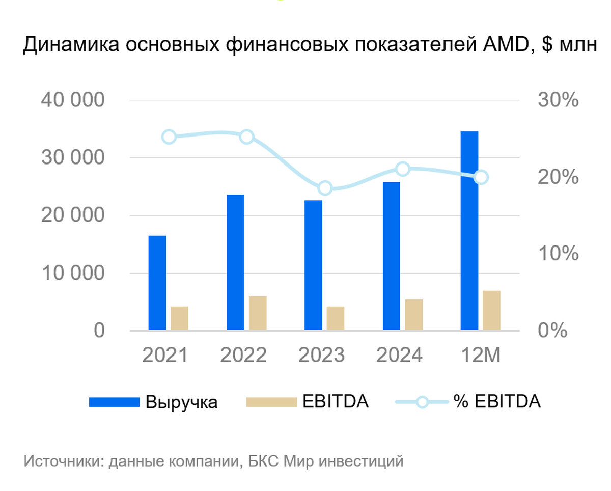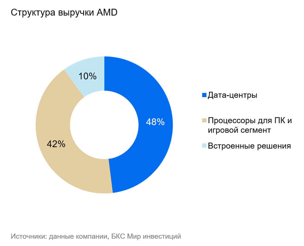 В последнее время результаты AMD лучше рынка за счет технологически сильных продуктов — серверных процессоров EPYC и графических ускорителей MI300X, MI325X и MI350.
