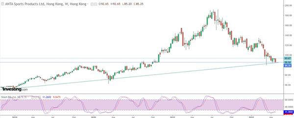 На недельном графике акции Anta скорректировались к долгосрочному восходящему тренду. Стохастик RSI указывает на перепроданность акций. Уровень поддержки формируется на уровне 85 HKD, акции могут протестировать уровень сопротивления 93 HKD.