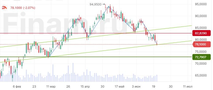 На дневном графике акции Anta Sports сформировали фигуру «голова и плечи», в рамках паттерна снижение котировок может продолжиться до уровня HKD 72–73.
