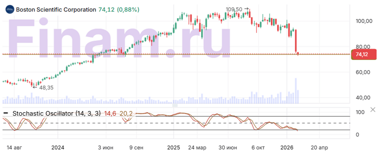 На недельном графике Boston Scientific видно, что цена просела к значимому уровню поддержки 74 и с учетом перепроданности есть вероятность отскока цены в среднесрочной перспективе.