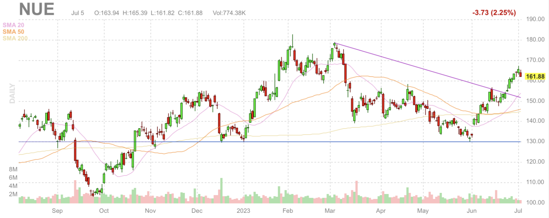 Nucor объявила прогноз по прибыли за 2К 2023 в размере от $ 5,45 до $ 5,55 по сравнению с $ 4,45 в 1К 2023 и с $ 9,67 в 2К 2022. Компания планирует опубликовать квартальную отчетность до открытия рынков 25 июля 2023 г.