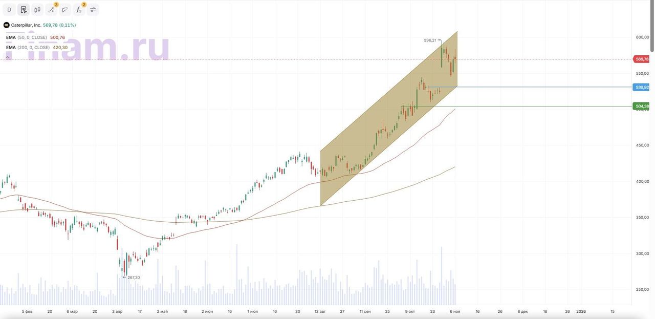 Caterpillar — дивидендный аристократ, поднимает дивиденды уже 31 год. Компания почти весь свободный денежный поток направляет на дивиденды и обратный выкуп акций. За 9 месяцев 2025 года выкупила собственные акции примерно на $4,2 млрд и выплатила $1,8 млрд дивидендов ($4,43 на акцию), поддерживая привлекательную доходность для акционеров и сокращая количество обращающихся акций примерно на 2%.