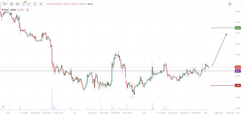 Котировки вышли из консолидации в восходящую структуру с растущими минимумами. Текущая коррекция выше поддержки выглядит как ретест диапазона, сохраняя приоритет роста. Пробой сопротивления в районе 53 руб. откроет путь к целевым уровня. При объеме позиции в 6% и выставлении стоп-заявки на уровне 47,80 руб., риск на портфель составит 0,40%. Соотношение прибыль/риск — около 3,00.