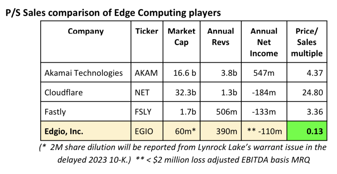 Если коэффициент Edgio равен всего лишь 1,0x revenues, EGIO должен торговаться на уровне 50–60. Далее пропорционально выше, если доходы будут расти даже постепенно. И когда он займет свое место среди Fastly, Akamai и Cloudflare в этом мире, он будет торговаться до 100-200.