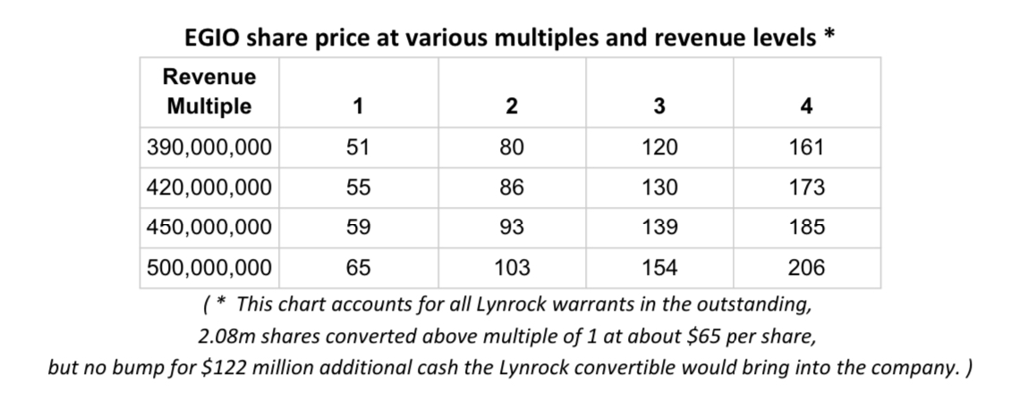 Цена акций EGIO при различных коэффициентах и уровнях выручки