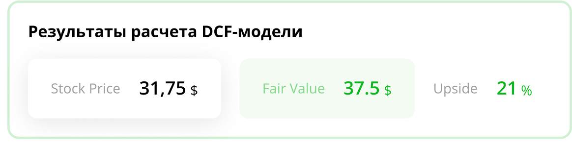Оценка компании на основании модели дисконтированных денежных потоков (DCF) по EBITDA на 5 лет указывает на справедливую цену $37,5 (потенциал +21%).