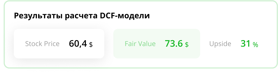 Оценка компании на основании модели дисконтированных денежных потоков (DCF) по EBITDA на 5 лет указывает на справедливую цену $73,6 (потенциал +31%)