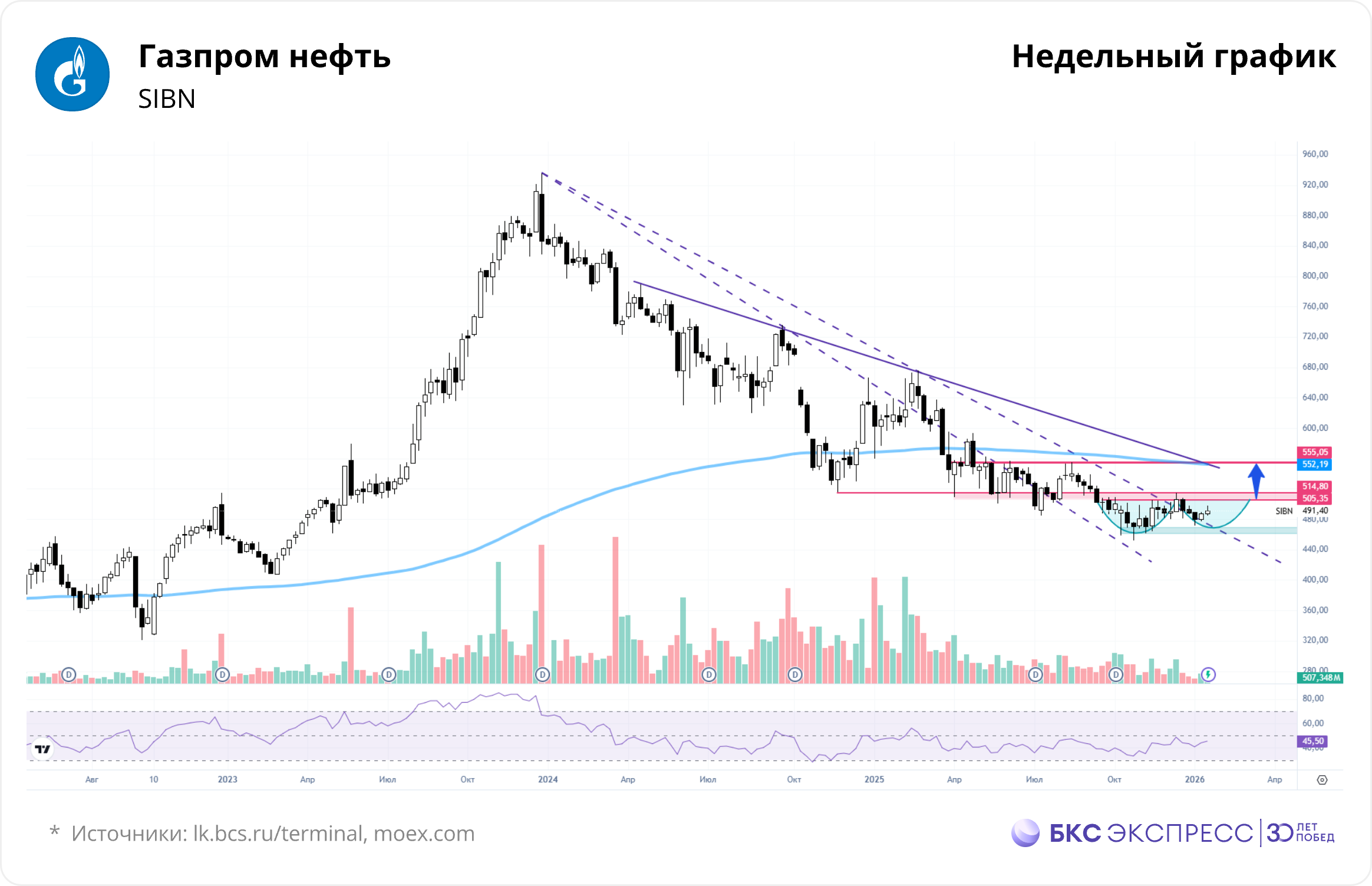С конца 2023 г. актив находился в нисходящей динамике, цена скорректировалась почти на 50%. 12 января котировки пробили долгосрочный нисходящий тренд.