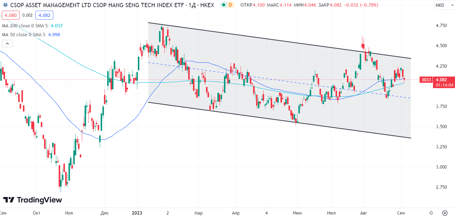 С начала года акции фонда торгуются в нисходящем канале, хотя отдельные непродолжительные периоды роста в рамках обозначенного торгового коридора наблюдались в марте, июне и июле. Перекупленности в акциях не наблюдается. При пробитии уровня HKD 4,30 и закреплении выше него возможно формирование восходящего тренда.