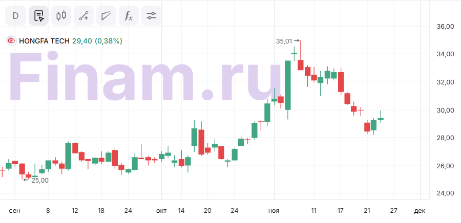 Акции Hongfa обладают потенциалом роста на 17,3%. Анализ стоимости по мультипликаторам P/E, EV/S, EV/EBITDA 2025E относительно аналогов предполагает таргет CNY 34,36.
