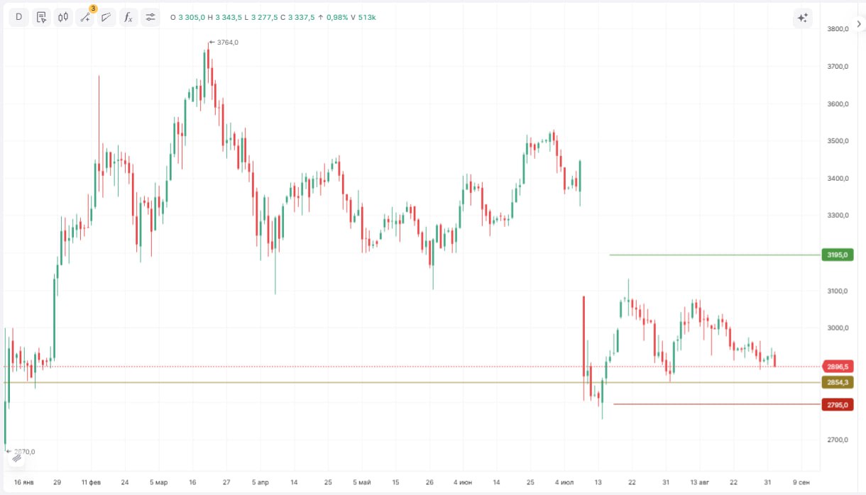 Акции торгуются вблизи локального уровня поддержки. При отскоке появляется потенциал движения наверх. Идея на рост бумаги с целью 3195 руб. При объеме позиции в 7% и выставлении стоп-заявки на уровне 2795 руб. риск на портфель составит 0,25%. Соотношение прибыль/риск составляет 2,92.
