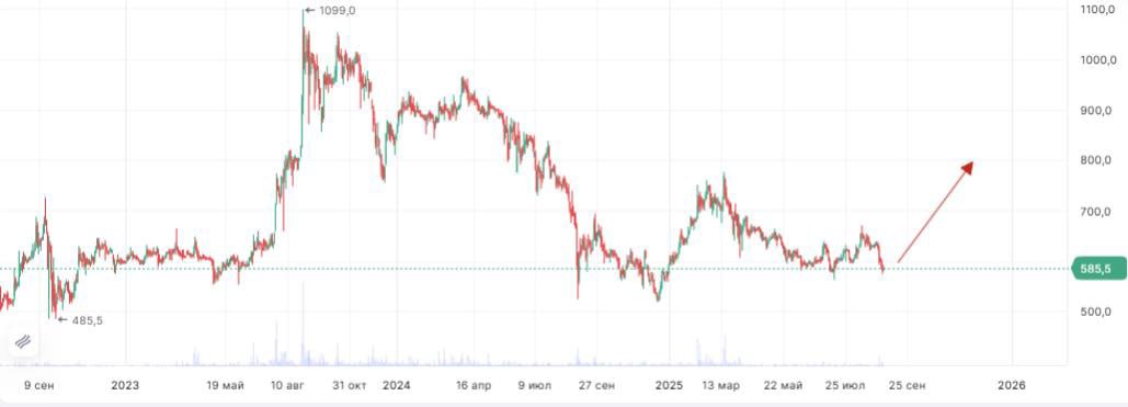 Цена находится на сильном уровне поддержки. При объеме позиции в 5% и выставлении стоп-заявки на уровне 550 руб. риск на портфель составит 0,30%. Соотношение прибыль/риск составляет 6,04.