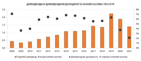 С 2008 года iShares Global Tech ETF осуществляет распределение дивидендных выплат дважды в год. Средняя годовая дивидендная доходность акций в 2008–2021 гг. составляет 5,5%. Падение доходности с 6,4% в 2019 году до 2,2% в 2021 году обусловлено как снижением выплат в абсолютном выражении, так и взлетом акций ETF. Принимая во внимание тот факт, что технологические компании в своем большинстве редко выплачивают дивиденды, дивидендные выплаты, пусть и невысокие, добавляют привлекательности фонду.