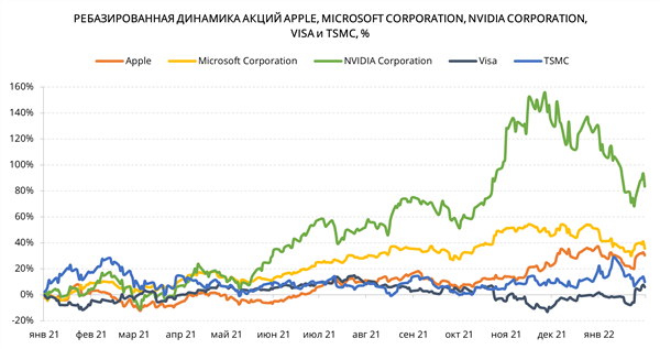 Из топ-5 эмитентов в портфеле ETF наибольшую доходность в 2021 году продемонстрировали акции NVIDIA Corporation, увеличившись на 125%. Бумаги Apple и Microsoft Corporation выросли в цене на 33,8% и 51,2% соответственно. Акции Visa завершили 2021 год в нуле, а TSMC прибавили 10,3%. В 2021 году акции iShares Global Tech ETF выросли на 28,8%, опередив бенчмарки NASDAQ Composite (21,4%) и S&P 500 (26,9%).