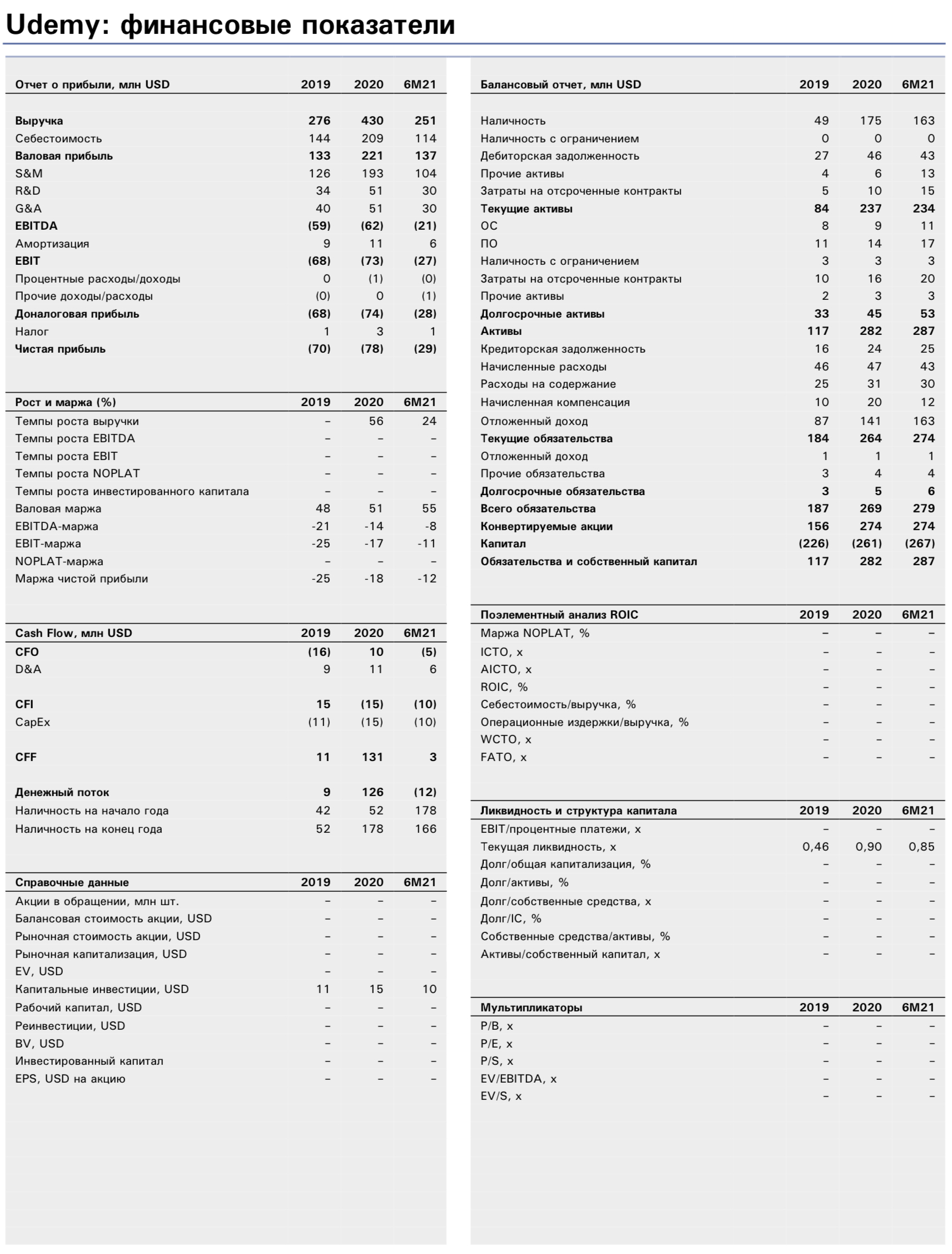 Потенциальный рынок и конкуренция. Согласно данным HolonIQ, глобальный рынок онлайн- и офлайн-образования в 2019 году составил $2,6 трлн в сфере высшего образования, корпоративного обучения и онлайн-обучения. Компания оценивает свой адресный рынок в $223 млрд. Конкуренты на рынке – Pluralsight, LinkedIn Learning, Skillsoft, Coursera, edX, A Cloud Guru и Skillshare.