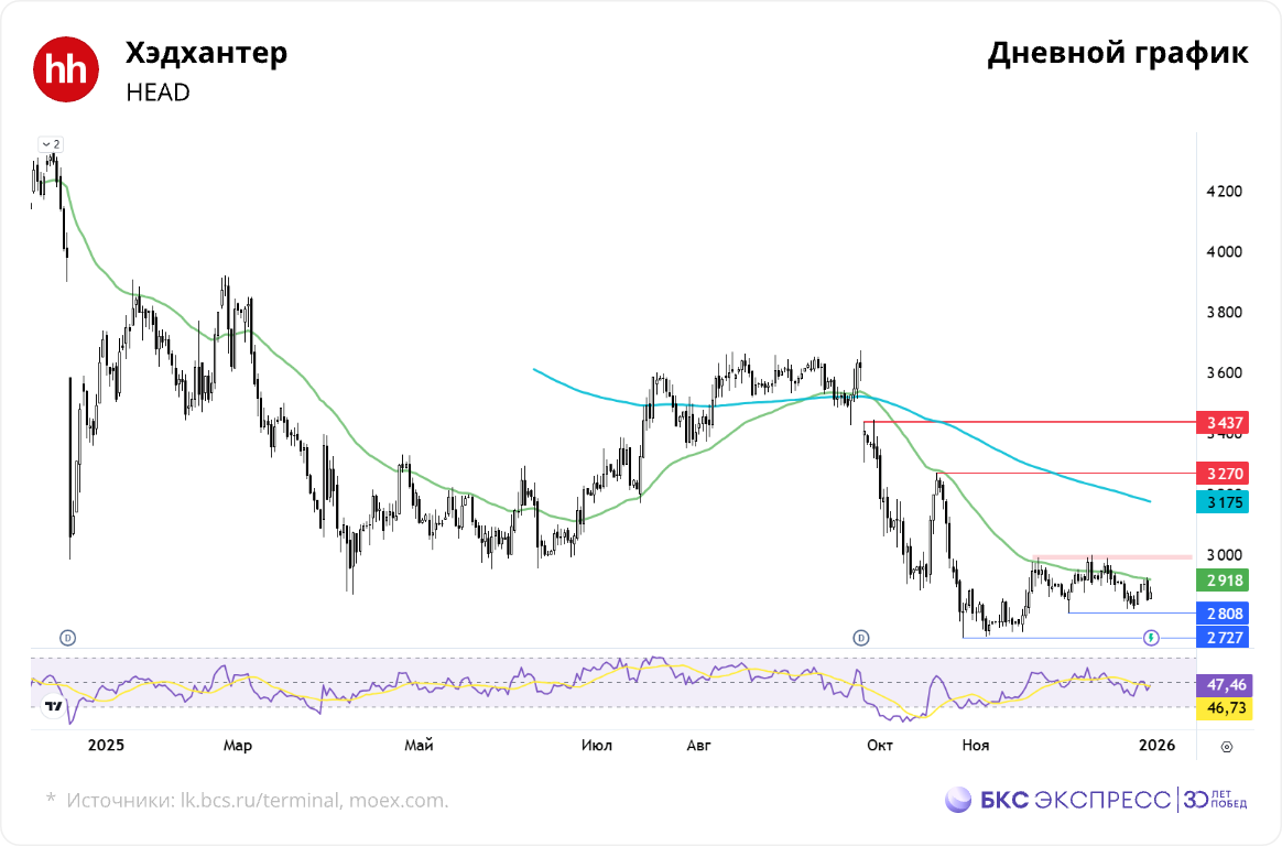 Акции Хэдхантера остаются одними из наиболее перспективных в секторе, несмотря на давление процентных ставок на бизнес-модель компании. Также, бумаги сохраняют технический запас для роста, так как демонстрировали сдержанную динамику относительно декабрьских лидеров рынка — привлекательно в смысле инвестиционной возможности.