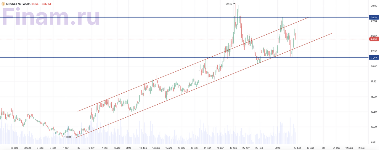 Акции Kingnet Network движутся в рамках длительного восходящего тренда, находясь примерно посередине между уровнями CNY 21,5 и 28,1. В ближайшее время возможна небольшая коррекция после недавнего активного роста, однако в долгосрочной перспективе сохраняется устойчивая восходящая динамика.