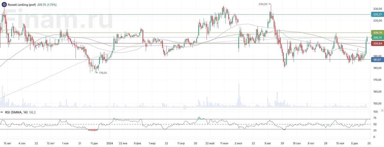 На дневном графике видно, что в ходе резкого подъема на фоне декабрьского сюрприза Банка России котировки привилегированных акций «Россети Ленэнерго» пересекли уровни 50-, 100- и 200-дневных скользящих средних. В случае успешного закрепления выше 200-дневной скользящей средней высока вероятность роста до сопротивления в районе 209 руб. Среднесрочной целью роста являются уровни, близкие к годовым максимумам, около 225 руб.