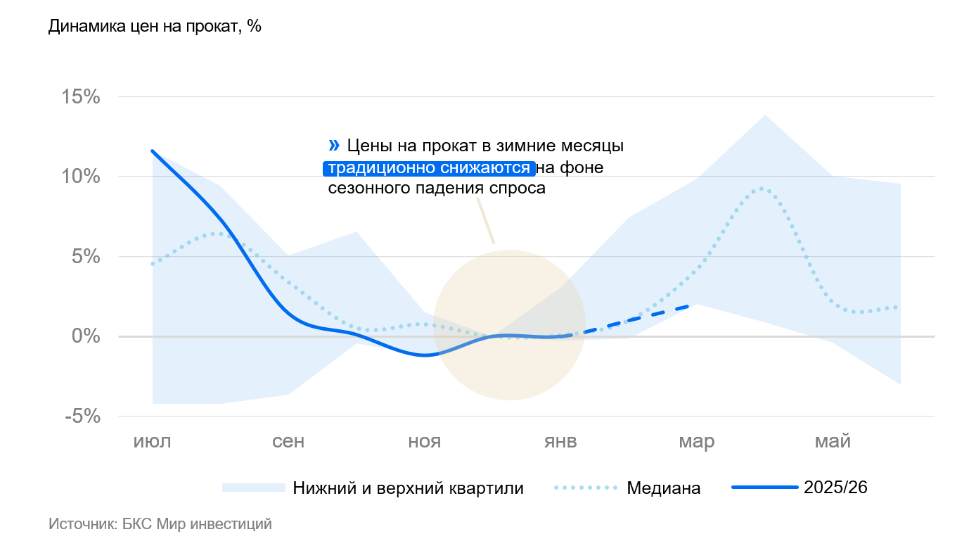 Еще один важный фактор для рынка — сезонность спроса. Как мы уже отмечали, основным потребителем стальной продукции является строительный сектор. В начале года спрос со стороны девелоперов традиционно ниже, чем с апреля по октябрь. А учитывая серьезное падение потребления стальной продукции по итогам 2025 г., полагаем, спрос останется под давлением и в I квартале 2026 г., а его восстановление, вероятно, будет небыстрым.