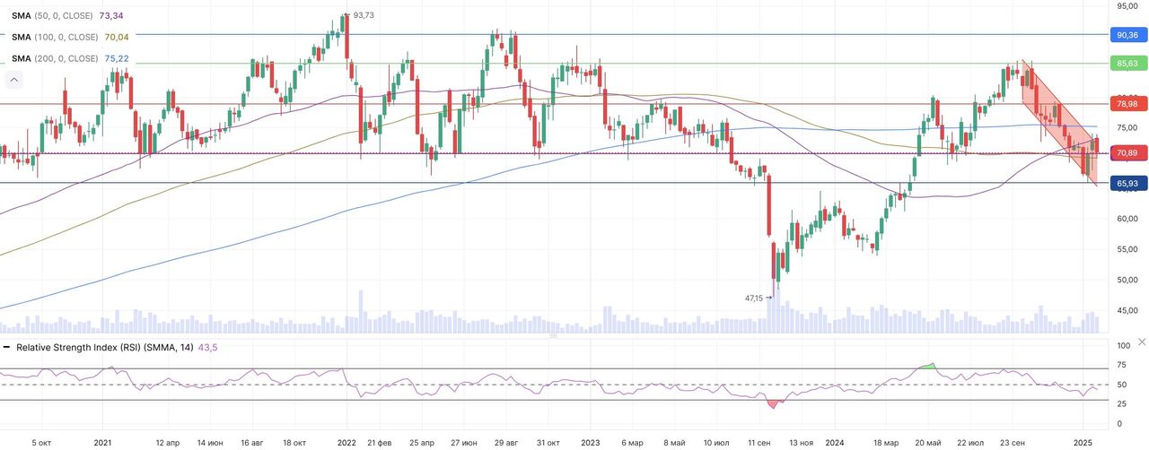 На недельном графике видно, что в последние две недели котировки NextEra Energy пытаются пробить верхнюю границу многомесячного нисходящего коридора, которая находится вблизи 50-недельной скользящей средней на уровне $73. В случае успешного пробоя можно ожидать рост до 200-недельной скользящей средней на уровне $75, а затем до уровня сопротивления около $79.