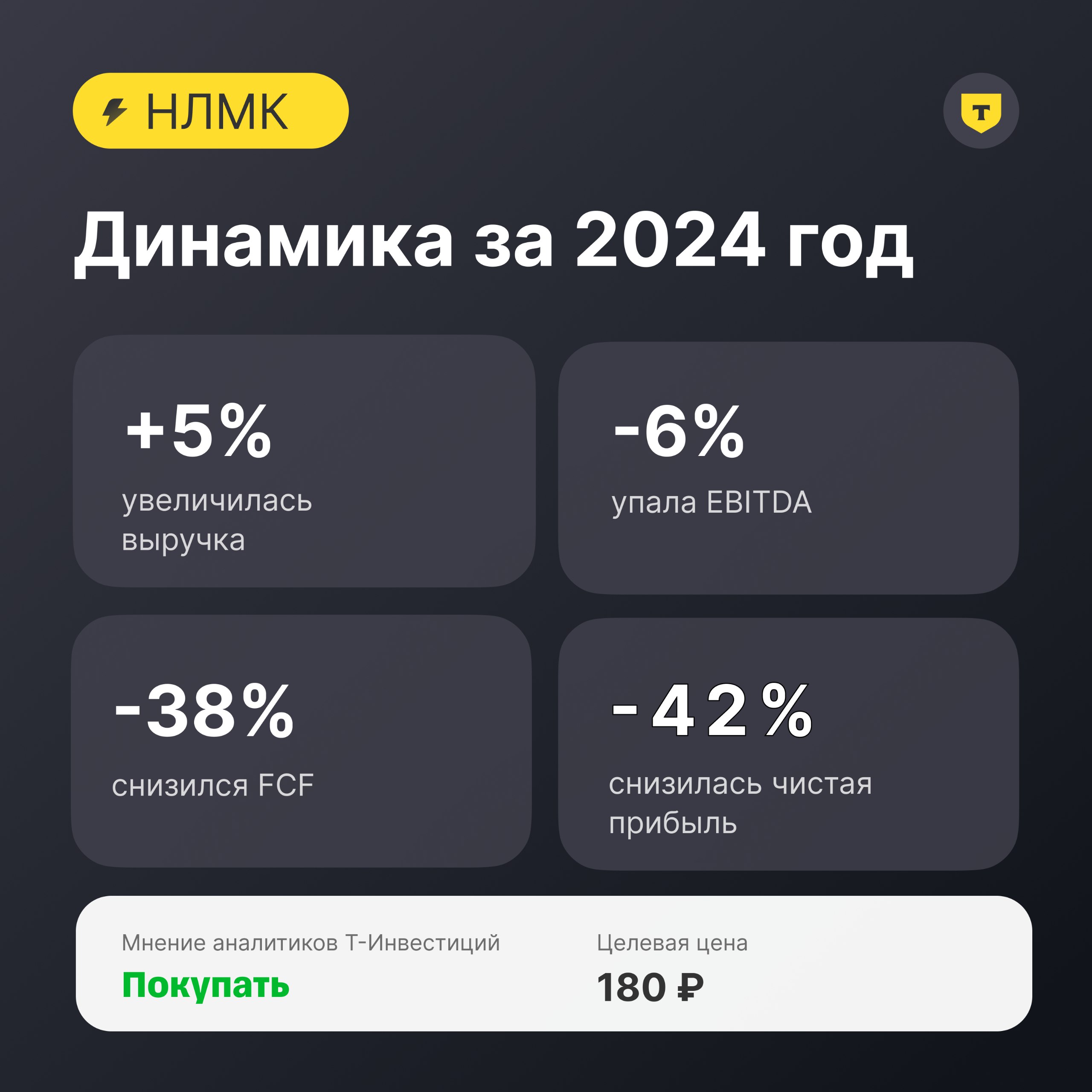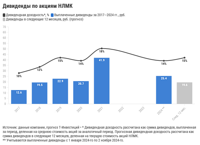 Мы ожидаем, что НЛМК направит на выплату дивидендов 100% от FCF за 2024 год. По нашим расчетам, размер дивидендов по акциям НЛМК в следующие 12 месяцев может составить 22,8 рубля на акцию, доходность к текущей цене — 13%.