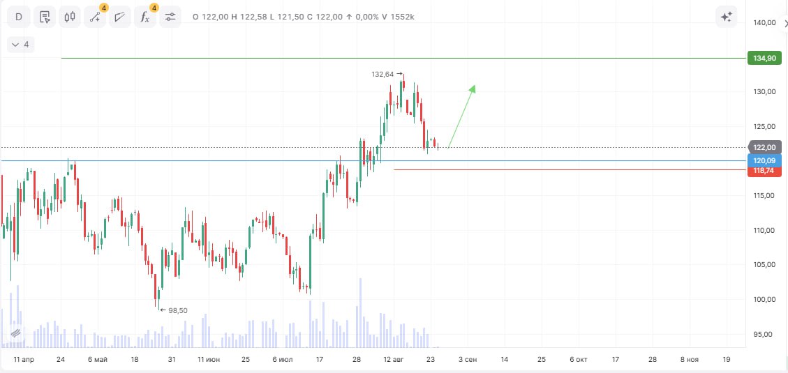Восходящий тренд продолжается, цена закрепилась выше пробитого сопротивления 120 рублей. При объеме позиции в 8% и выставлении стоп-заявки на уровне 118,49 руб. риск на портфель составит 0,24%. Соотношение прибыль/риск составляет 3,50.