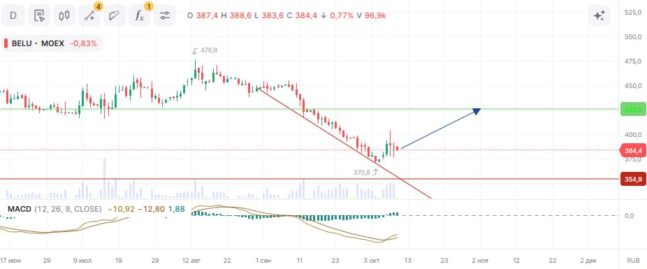 Актив завершил этап снижения, пробив ключевой уровень нисходящего тренда. После тестирования области исторических минимумов успешно провел ретест пробитой линии сопротивления. Цена закрепилась выше уровня бывшего трендового сопротивления, подтвердив смену тенденции. При объеме позиции 6% и выставлении стоп-заявки на уровне 354,9 руб. риск на портфель составит 0,45%.