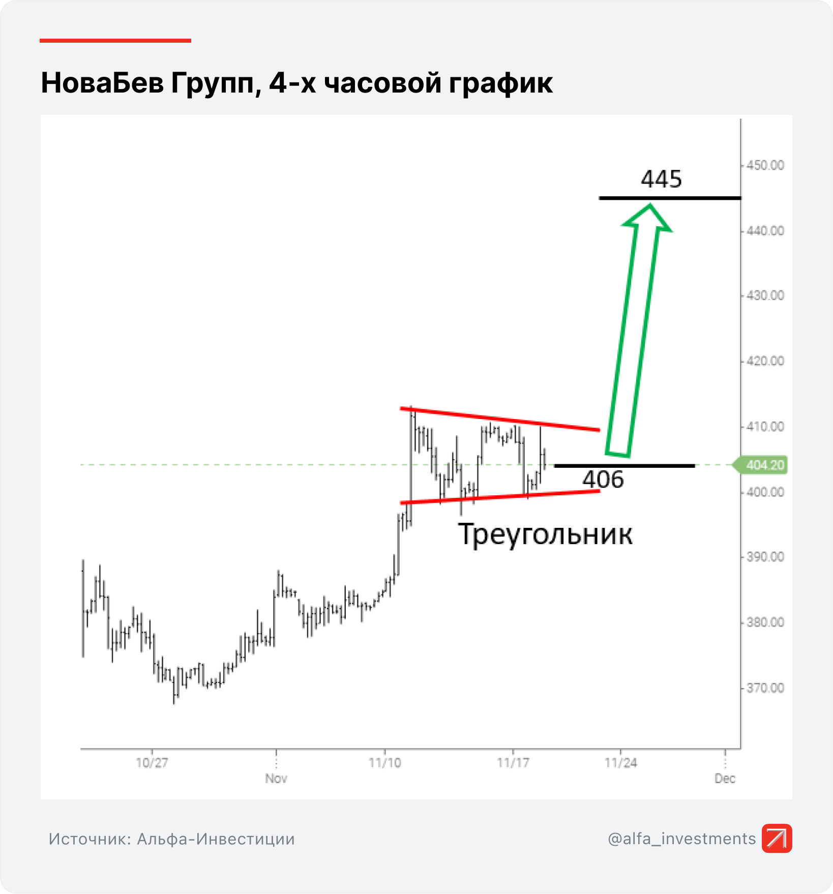 В последнее время наблюдается интересная динамика котировок акций НоваБев. На текущий момент цена стабилизировалась выше отметки 400 руб., формируя характерную фигуру технического анализа «Треугольник». Эта формация говорит о постепенном сужении ценового диапазона и нередко предшествует существенному движению котировок в одном из направлений.