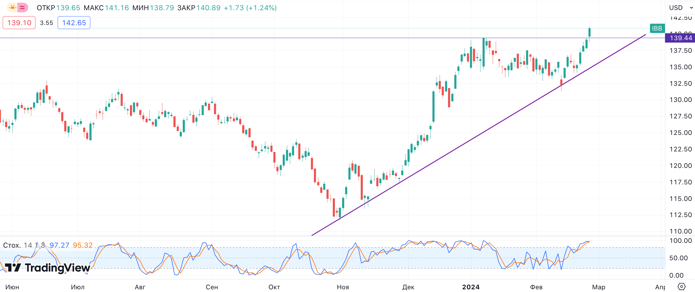 В ноябре 2023 года iShares Biotechnology ETF отжался от многомесячного дна и перешел в фазу отскока, которая в настоящее время продолжается. Биотехнологический ETF уверенно опережает рынок по доходности за последние 3 мес. — доходность инструмента за период составляет 18,8%, тогда как американские фондовые индексы поднялись на 11,6% и 12,6% соответственно.