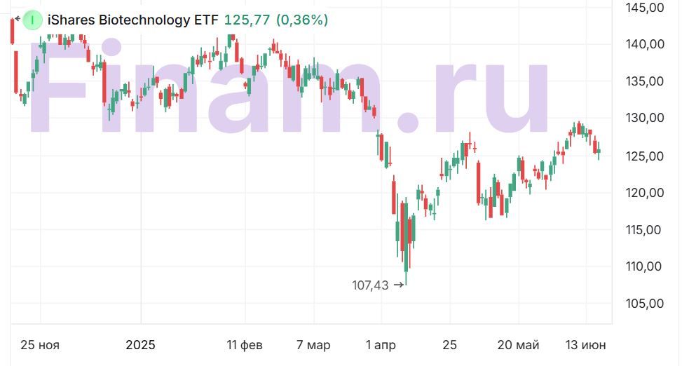 Наибольшие доли в рассматриваемом ETF имеют биофармацевтические компании Amgen, Vertex Pharmaceuticals и Regeneron Pharmaceuticals.