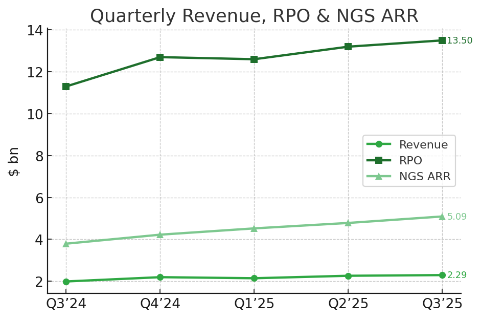 Как это работает в цифрах. Гайд компании на FY25 — выручка $9,17–$9,19 млрд (+14%), NGS ARR $5,52–$5,57 млрд (+31%–32%), non-GAAP op-маржа 28,2%–28,5%. На ближайший квартал (Q4’25) — выручка $2,49–$2,51 млрд и EPS $0,87–$0,89. То есть менеджмент подтверждает, что уже подписанные и идущие по расписанию контракты перекрывают план по росту без «подвигов» в продажах «с нуля».