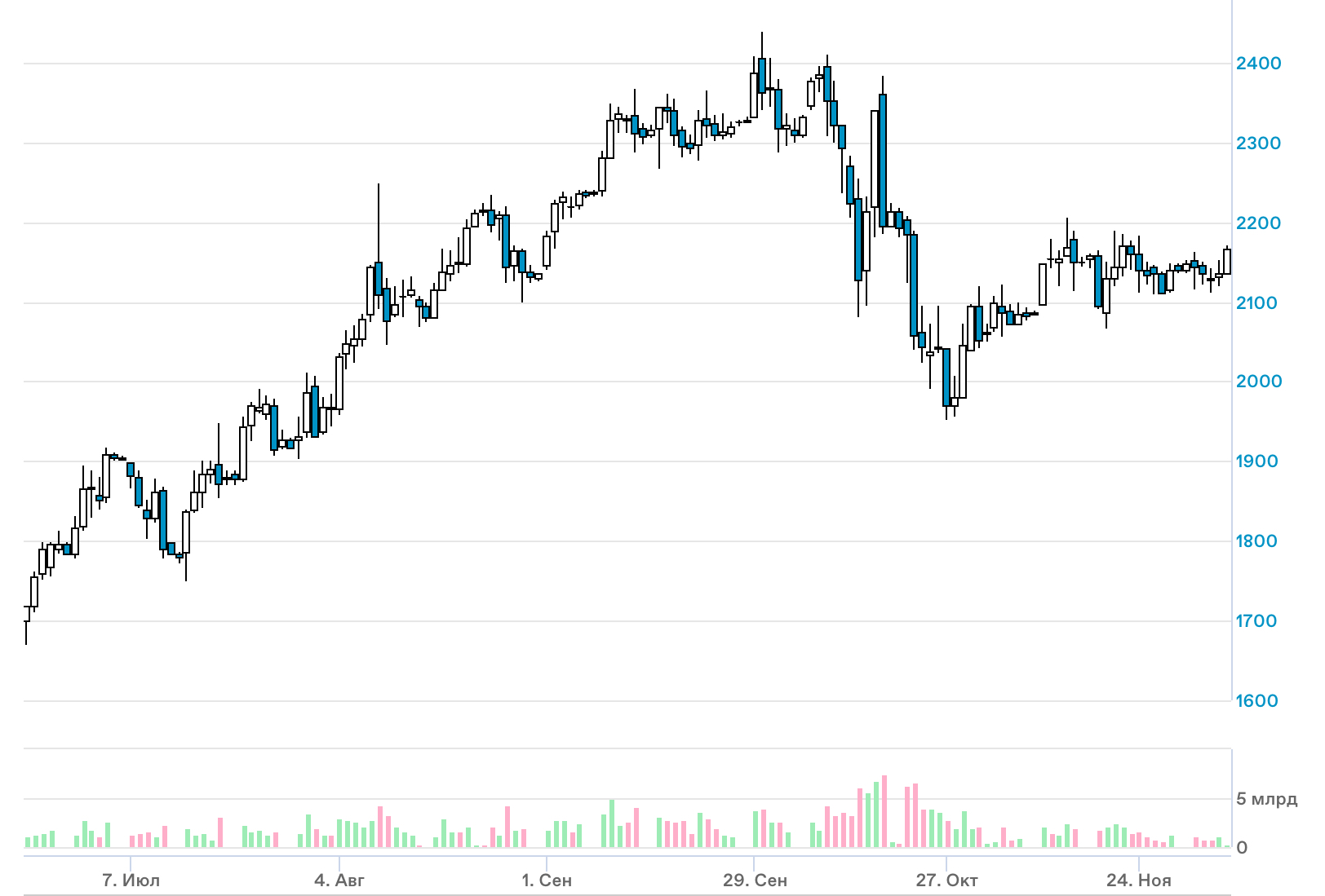 На фоне роста цены золота котировки Полюса сохраняют довольно крутой восходящий тренд более трех лет. В октябре 2025 г. бумаги отскочили от динамичной границы и 200-дневной скользящей средней.