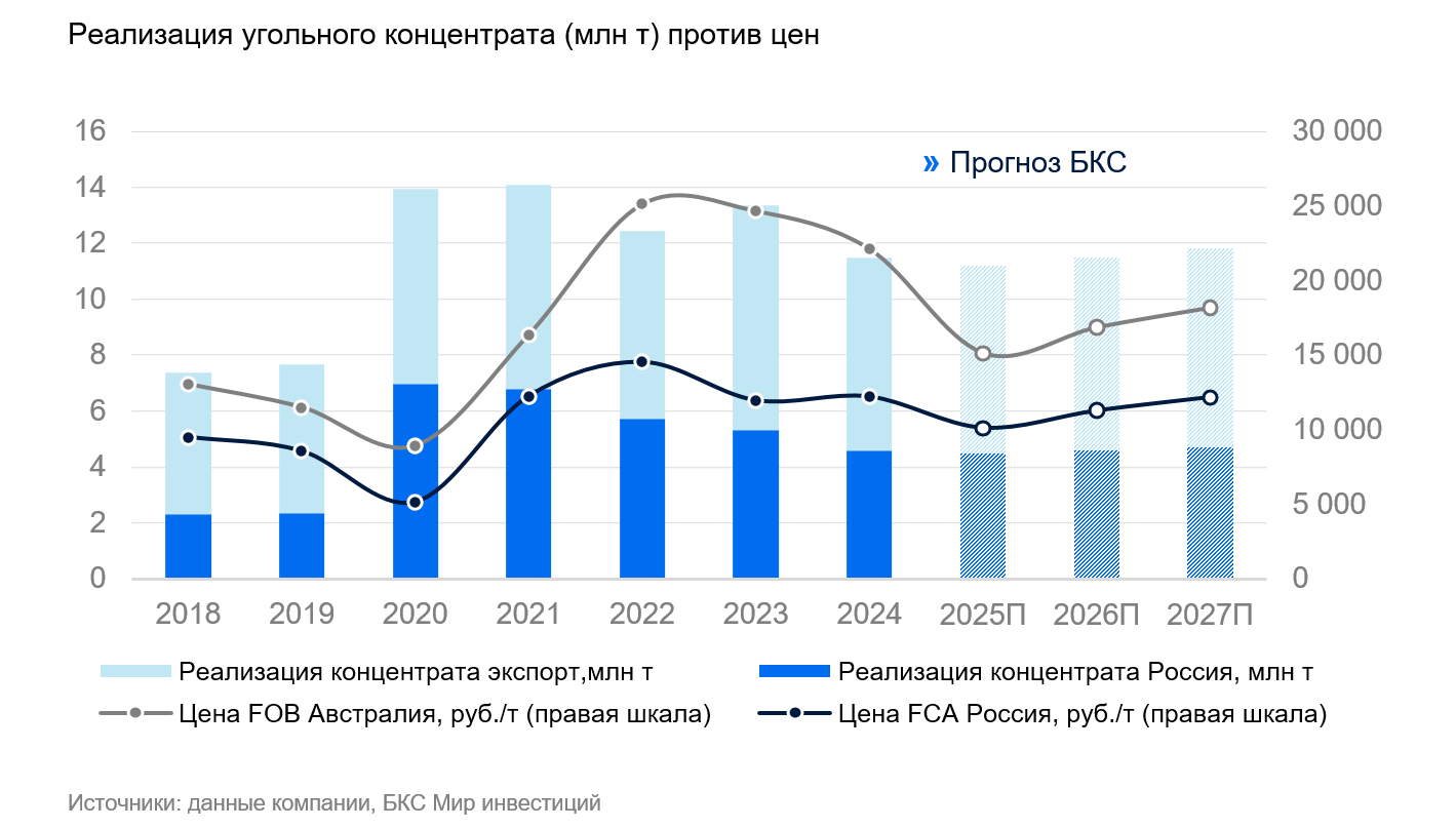 По нашим расчетам, на горизонте 12 месяцев при и ослаблении рубля до 93 руб. за доллар бумага будет торговаться с мультипликатором P/E на уровне 13х. Ждем, что оценка окончательно нормализуется только в 2028 г. Для «Позитивного» взгляда необходим рост цен на уголь на 50%, либо ослабление рубля до уровня 102 руб. за доллар. Оба сценария представляются нам маловероятными.
