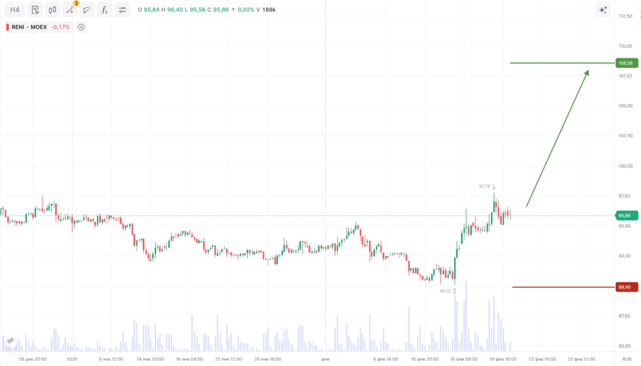 Акции формируют зону консолидации вблизи ключевого уровня поддержки после глубокой коррекции, при этом минимумы постепенно повышаются, что указывает на нарастающий интерес покупателей. При объеме позиции в 6% и выставлении стоп-заявки на уровне 89,95 руб., риск на портфель составит 0,38%. Соотношение прибыль/риск составляет 2,08.