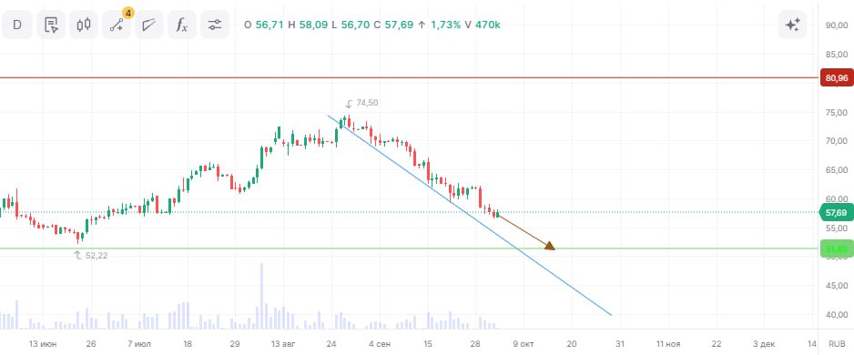 Актив находится в фазе устойчивого нисходящего тренда. Текущая структура графика сохраняет медвежий настрой, а обновление минимумов поддерживается возрастающими объемами продаж. При объеме позиции в 7% и выставлении стоп-заявки на уровне 80,96 руб. риск на портфель составит 2,82%. Соотношение прибыль/риск составляет 0,27.