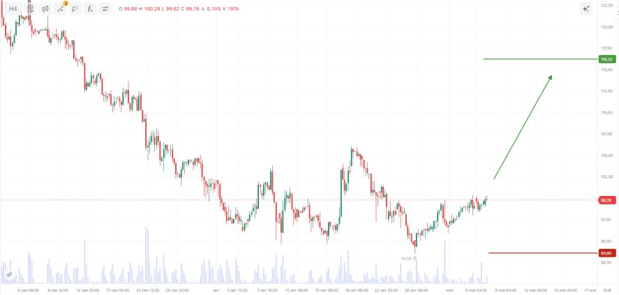 Бумага протестировала уровень поддержки, отскочила и сломала нисходящий тренд пробоем ключевой отметки. После короткой консолидации под уровнем сопротивления формируется технический паттерн разворота. При позитиве на рынке высок шанс мощного импульса вверх с закреплением выше ближайших сопротивлений. При объеме позиции в 6% и выставлении стоп-заявки на уровне 93,15 руб., риск на портфель составит 0,41%. Соотношение прибыль/риск составляет 2,37.