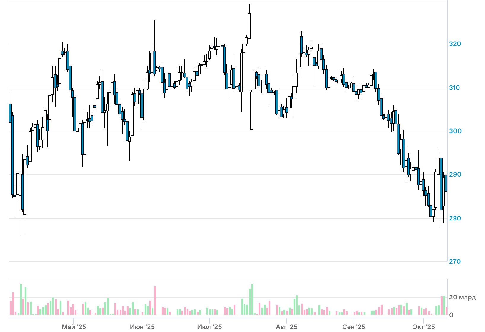 Акции Сбербанка сегодня растут на 2,5%, текущая котировка — 289 рублей. Наш прогноз на 12 месяцев — 402 рубля.