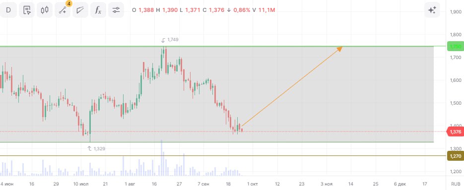 Актив консолидируется в боковом канале, демонстрируя четкие границы колебаний. При подходе к нижней границе канала формируются сигналы на отскок. При объеме позиции в 7% и выставлении стоп-заявки на уровне 1,274 руб. риск на портфель составит 0,52%. Соотношение прибыль/риск составляет 3,62.