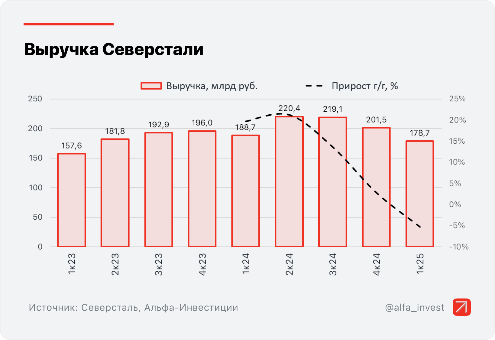 Выручка снизилась на 5% г/г, до 178,7 млрд руб., из-за падения средних цен реализации.