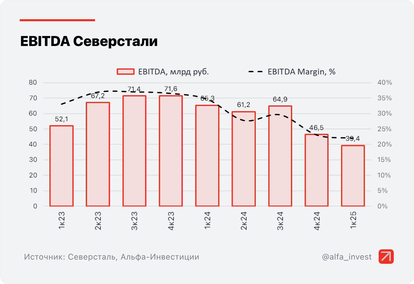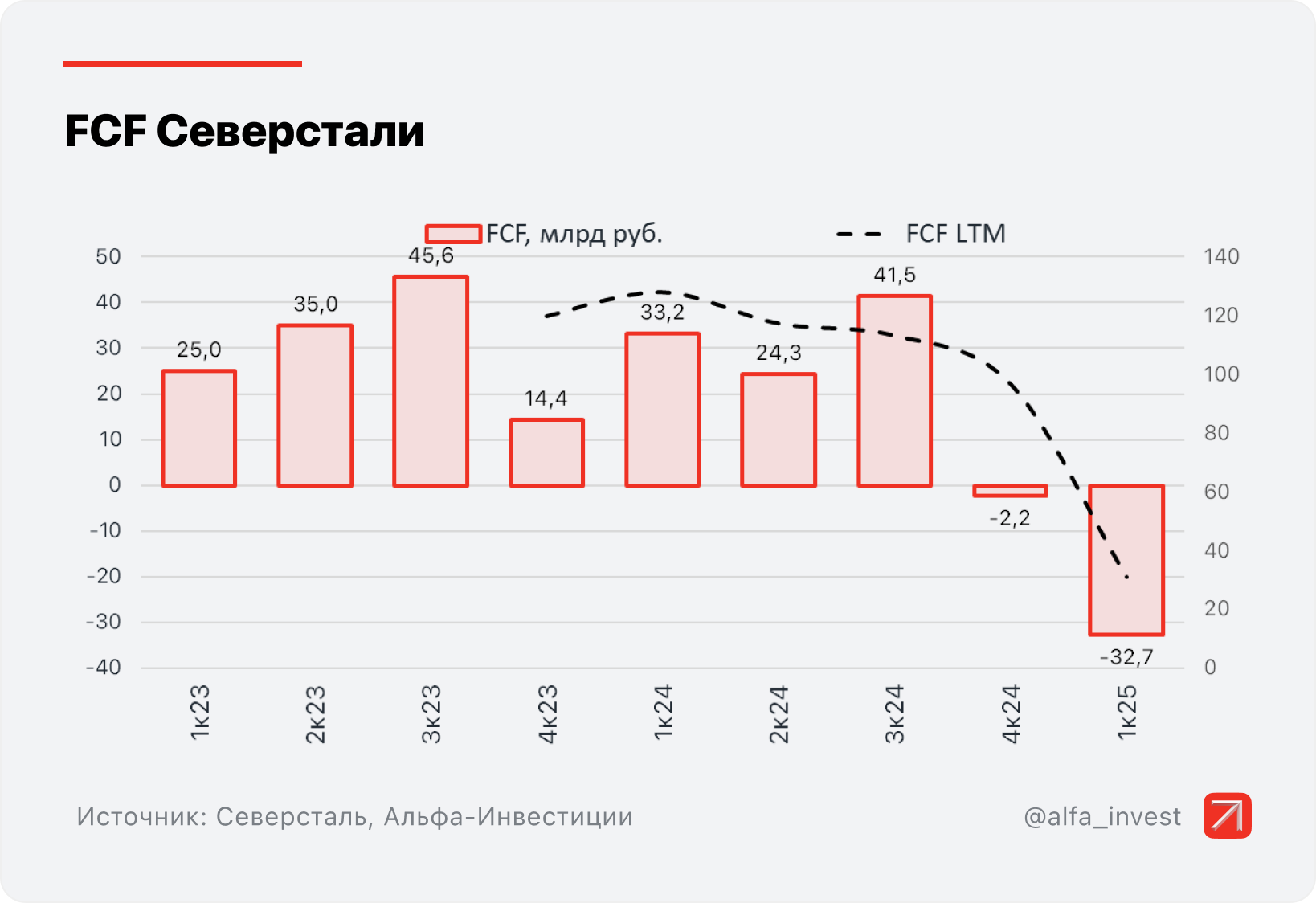 Снижение EBITDA, рекордные инвестиции, а также необходимость пополнить запасы слябов в преддверии грядущего ремонта домны, привели к снижению свободного денежного потока. В ситуации высокой неопределённости на рынке компания приняла решение не распределять дивиденды за I квартал 2025 года для обеспечения стабильного финансового положения в будущем.