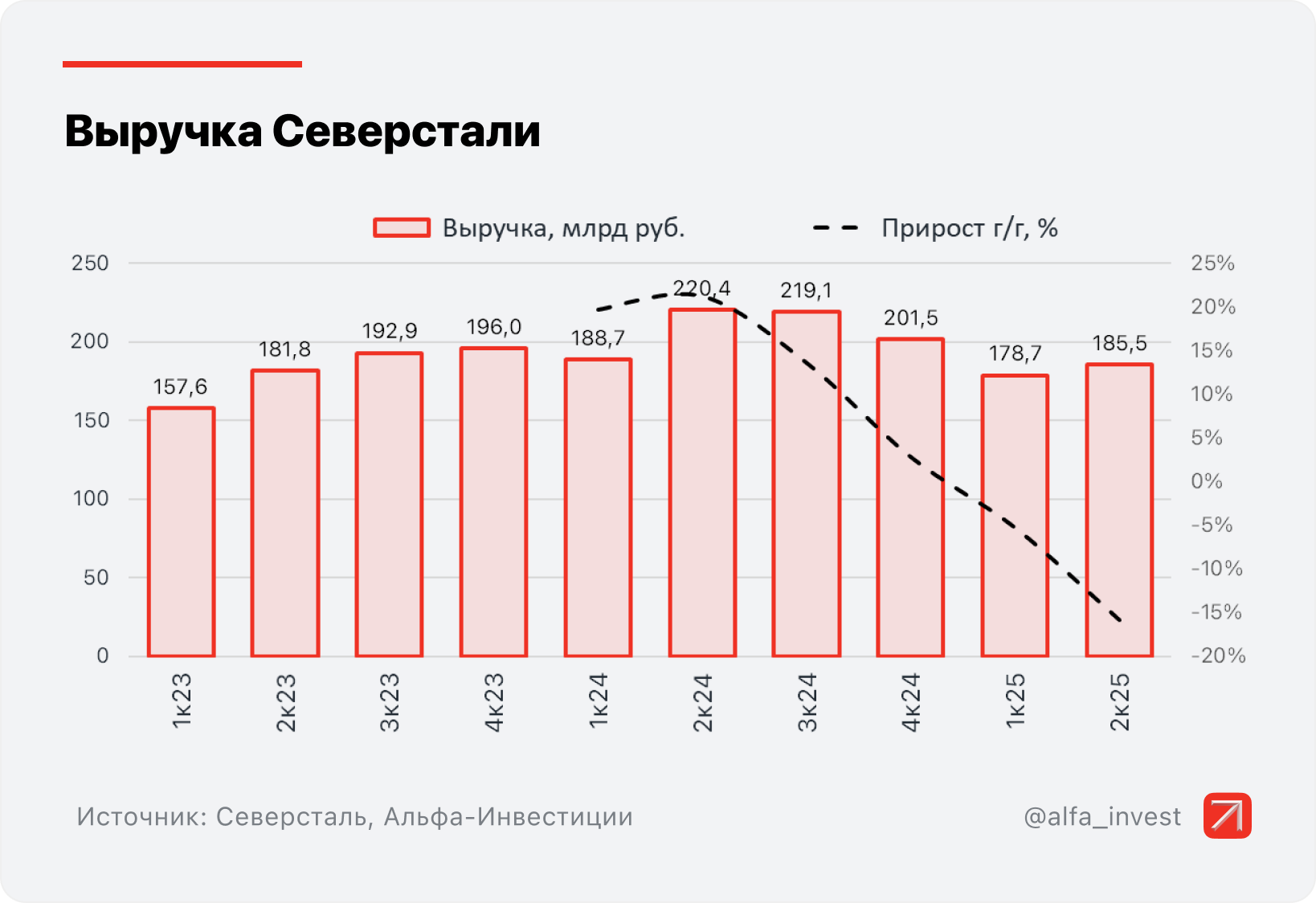 Выручка упала на 16% г/г, до 185,5 млрд руб., из-за снижения средних цен на металлопродукцию, в том числе на фоне увеличения доли полуфабрикатов в портфеле продаж.