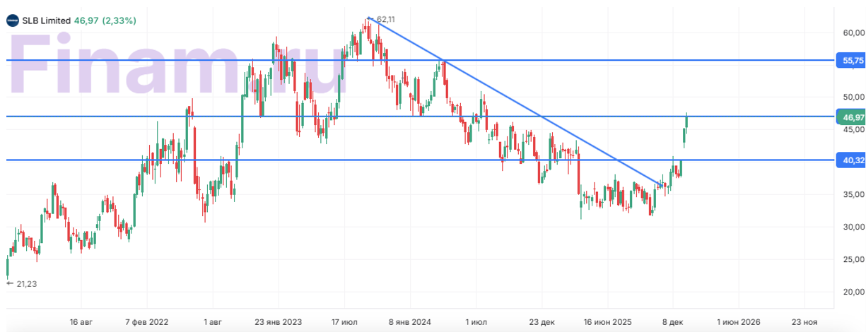 SLB может стать одним из бенефициаров недавних событий в Венесуэле и Иране. Если США действительно займутся восстановлением нефтяной отрасли Венесуэлы, это может потребовать значительных инвестиций, что сделает крупные нефтесервисные компании основными бенефициарами. Пока сложно сказать, чем закончатся протесты в Иране, но локально геополитическая напряженность уже привела к небольшому росту цен на нефть, что позитивно для акций SLB.