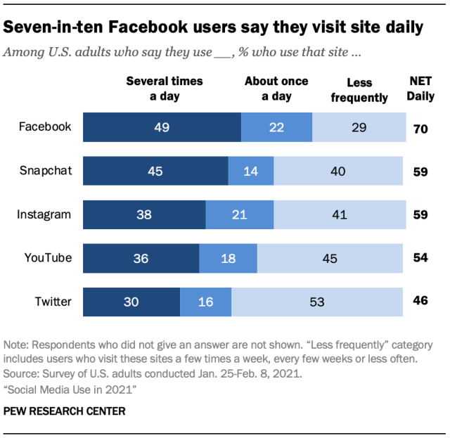 По сравнению с аналогами, статистика вовлеченности Snapchat также довольно хороша. Сообщается, что 59% пользователей Snapchat используют приложение ежедневно, что точно соответствует 59% пользовательской базы Instagram, которые открывают приложение один раз в день. Это ежедневное активное использование также превосходит использование YouTube и Twitter в первую очередь из-за их преобладающей пользовательской базы — более молодого поколения. По данным Pew Research Center , эти цифры еще выше среди лиц в возрасте от 18 до 29 лет, из которых 71% используют приложение ежедневно.