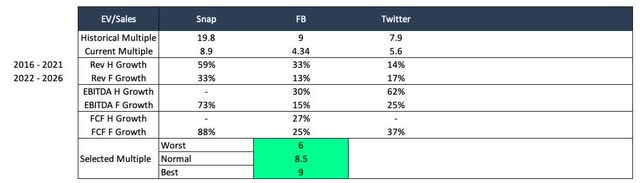 Хотя это и не сравнение «яблок с яблоками», учитывая, что Meta имеет значительно более высокую маржу (валовую, операционную, чистую), является лидером рынка, а Snapchat даже не приносит прибыли на основе GAAP. А также тот факт, что Snapchat — это гораздо меньший бизнес. и, следовательно, их будущие темпы роста намного выше, если исходить из более низкой базы, кажется оправданным, что Snap должна торговаться с мультипликатором, несколько схожим с историческим мультипликатором Meta, но с небольшим дисконтом (0,5)X. Таким образом, мы выбрали базовую относительную оценку (RV), кратную 8,5X.