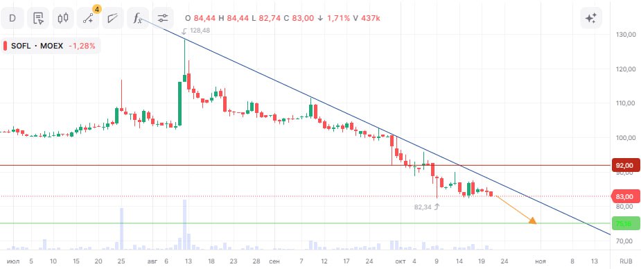 Актив неоднократно тестировал сопротивление нисходящего тренда, но каждый раз откатывался вниз. При объеме позиции в 7% и выставлении стоп-заявки на уровне 92 руб. риск на портфель составит 0,76%. Соотношение прибыль/риск составляет 0,86.