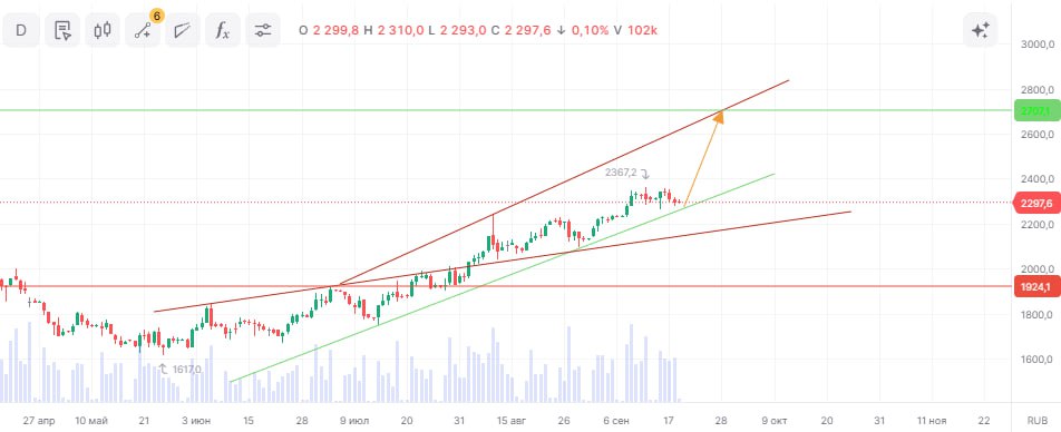 Актив торгуется в восходящем тренде и недавно пробил уровень сопротивления, подтверждая силу покупателей. Цена закрепилась в восходящем канале, что указывает на контролируемое движение вверх. Текущие уровни поддержки и сопротивления формируют четкие границы для торговли. Объемы умеренные, но достаточные для подтверждения текущей динамики. При объеме позиции в 8% и выставлении стоп-заявки на уровне 1924,1 руб. риск на портфель составит 1,3%. Соотношение прибыль/риск составляет 1,1.